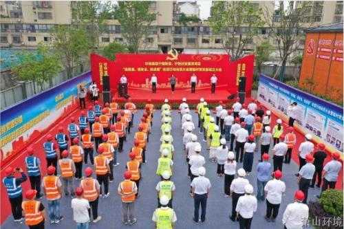 萧山情形集团党委书记施素梅,,,,,,,党委委员、副总司理何军、江峰应邀出席运动,,,,,,,项目主体单位、各参建单位相关职员以及新安、宁牧安顿房项目暂时党支部全体党员共100余人加入运动。。。。。。。