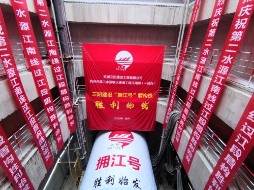 随着始发令的下达,,,,,,,陪同着隆隆的轰鸣声,,,,,,,过江段“拥江号”盾构刀盘徐徐转动,,,,,,,身着红妆的盾构机整体徐徐向前掘进,,,,,,,江南线项目过江段盾构在钱塘江畔顺遂始发,,,,,,,标记着过江段正式进入区间盾构施工阶段,,,,,,,杭州市第二水源输水通道工程建设再次取得重大希望,,,,,,,掀开了工程建设的新篇章。。。。。。。