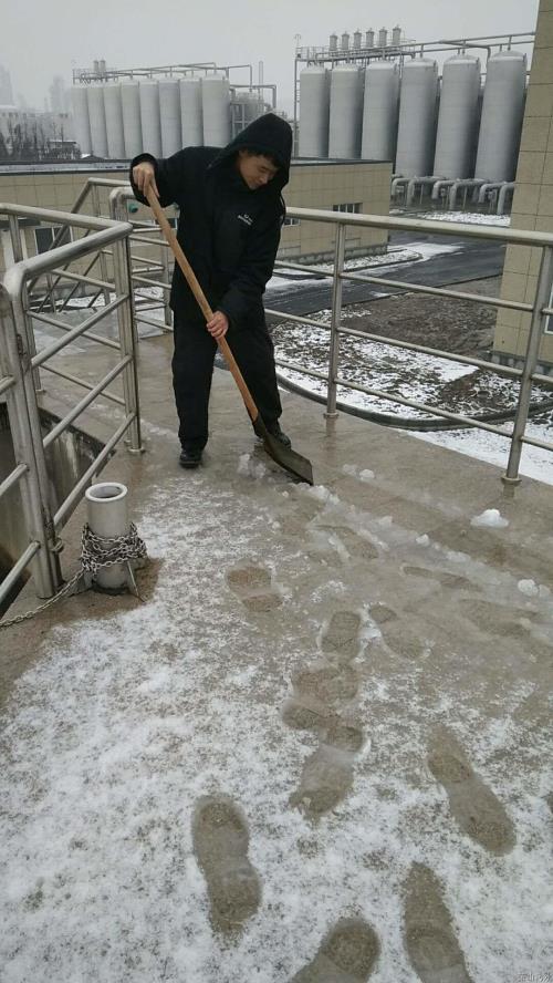 有一种追求叫贡献。。。。。在临江厂门口,,,,,,在污水池上,,,,,,冰天雪地正冷的时间,,,,,,大伙自觉组织扫雪;;;;;;浓缩池刮泥机支持杆被大雪压断,,,,,,机修职员冒雪室外作业几小时,,,,,,修复故障确保提标段生产运行。。。。。