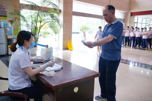 用户佩带口罩有序进入,,,,,举行体温丈量、出示康健码、挂号身份信息。。。。。。。。