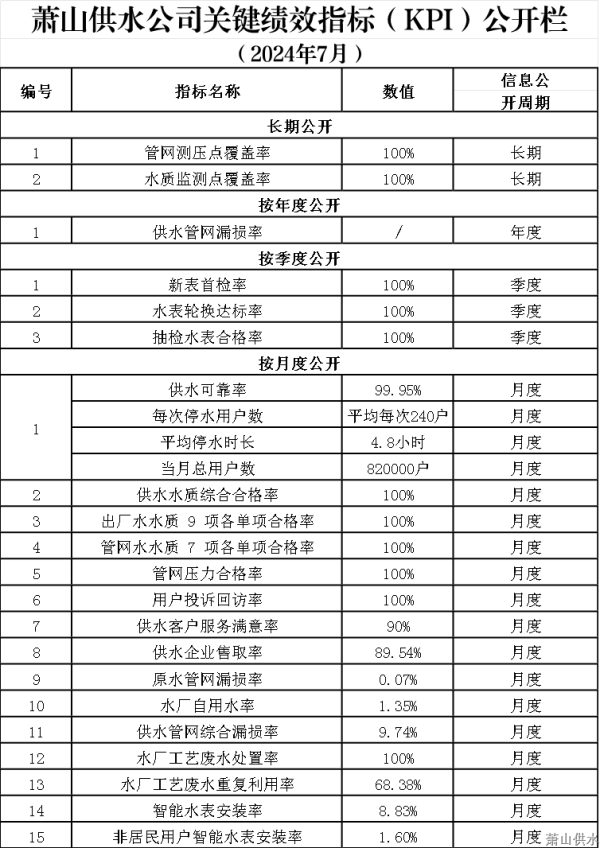萧山供水公司要害绩效指标(KPI)果真栏(2024年7月)