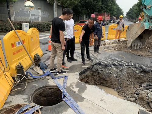 7月15日黄昏,,,,,,,,污水公司事情职员在一样平常巡查历程中发明闻堰街道桥南路与五金路路口地面蹊径沉降显着,,,,,,,,经检查发明为DN500污水管破碎。。。。。。为避免爆发清静事故,,,,,,,,南片运管中心连夜举行紧迫抢修,,,,,,,,16日下昼6时,,,,,,,,污水管道已恢复正常运行。。。。。。