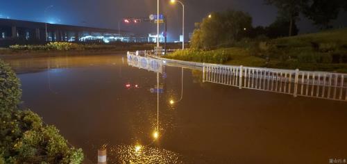 76日破晓3时许,,,,,,经由7小时强排,,,,,,江东大道与梅林大道交织口路面积水情形获得解决。。。。。。。。