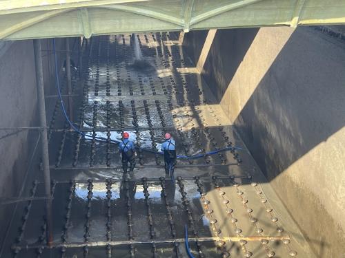 钱江厂妄想使用春节前后水量低位的窗口期,,,,,对二期生化反应池A池曝气系统举行大修,,,,,工程主要涉及破损曝气膜替换、梗塞曝气膜洗濯、ABS立柱替换为304不锈钢材质等,,,,,需周全清池作业。。。。。施工总工期预计39天,,,,,其中清池阶段20天,,,,,维修阶段19天。。。。。